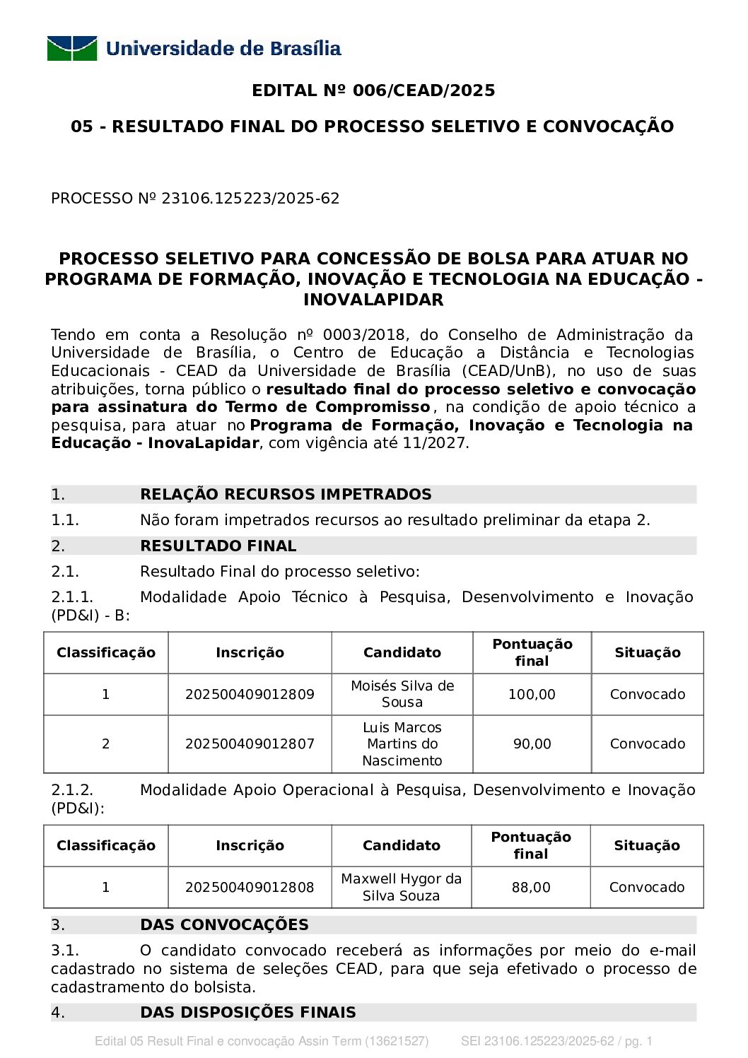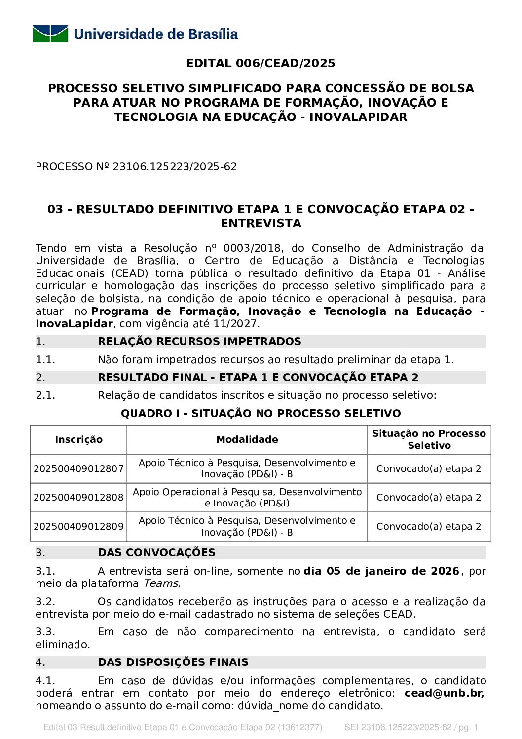 Resultado da etapa 1 e convocação