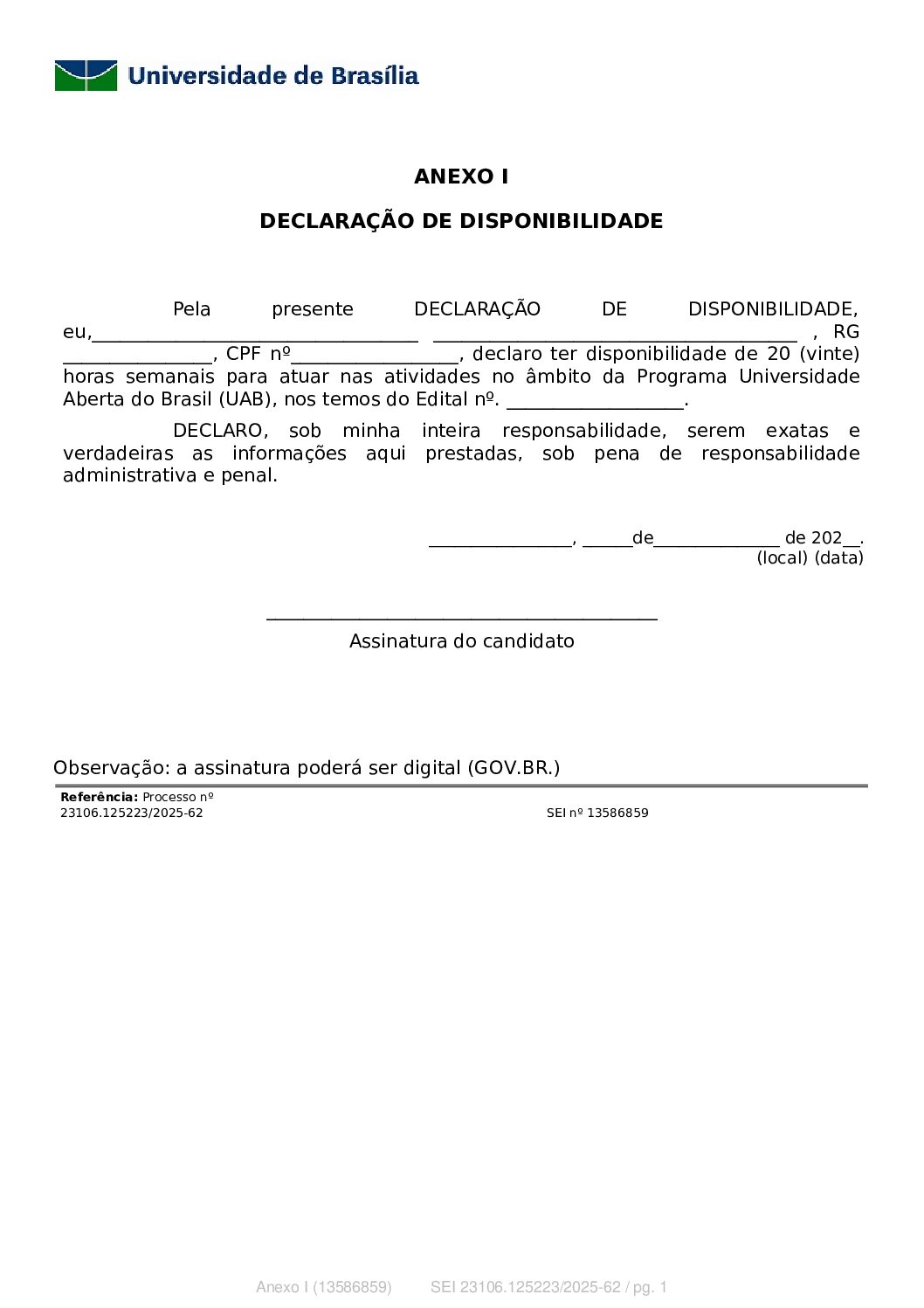 Anexo I - Declaração de Disponibilidade